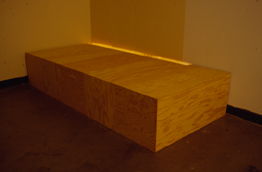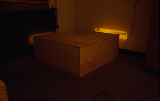 Trevor Mahovsky’s work combines the hard veneer of minimalist sculpture with a softer, roughly pre-cinematic interior. Animated back-lit dioramas featuring children’s toys are housed within each of the two plywood sculptures. In the L-shaped Lantern for Corner, one branch features a land of dinosaurs, and in the other branch an astronaut carries out an unspecific task on some distant planet or moon. In Four Lanterns a soldier’s voice commands his allies to “back him up” in the battlefield. Abutted almost against the gallery walls, one can only achieve an awkward glimpse of the shadow play cast by the toys by literally sitting or crawling over the plywood sculpture.