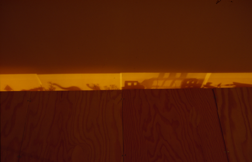 Mahovsky’s sculptures infantilize the brute ‘objecthood’ and static monumentality of minimalist sculpture by inserting a looping, kinetic and childlike narrative into its interior and onto the adjacent walls. The pre-modern, and pre-cinematic technique of the magic lantern polarizes the historical moment between the onset of modernism and film technology in the 19th century with its Greenbergian apotheosis in the ’60s and ’70’s, in this case the minimalist sculptures of artists Donald Judd or Robert Morris. The shadow show illicits the child’s world of narrative dissolution within an encompassing world of dinosaurs, war or space, and is a realm of role playing fantasy at odds with the psychic absence that apologists would suggest is the ideal receptive mode for viewing ‘high modernist’ art.