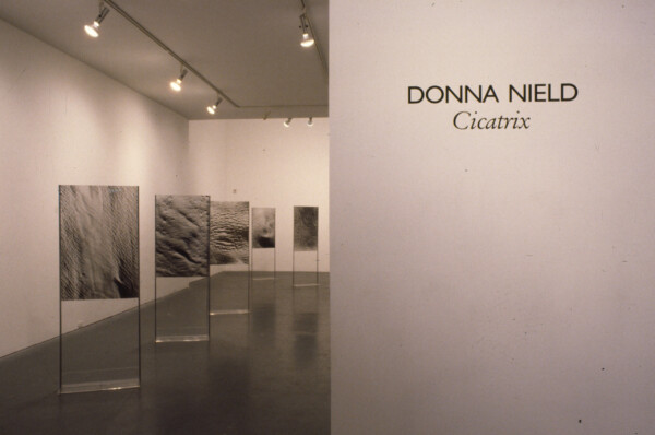 Nield states that her work investigates how scars on human bodies index traumatic events which form narratives, later remembered in relation to personal histories. The installation consists of photographic transparencies of enlarged scars which are displayed on freestanding Plexiglas stands. By using these display stands she is making reference to the idealized ‘feminine’ skin which is promoted as a product of contemporary advertising and cosmetology. The scars were cast in latex prior to being photographed. This process mimics a cosmetic promotion technique in which the customer’s skin is cast and magnified in order to diagnose ‘skin types’. In Cicatrix the images juxtaposed with identifYing texts provoke questions regarding the representation of the body as a means to locate or fix identity.