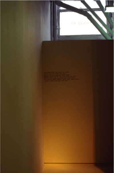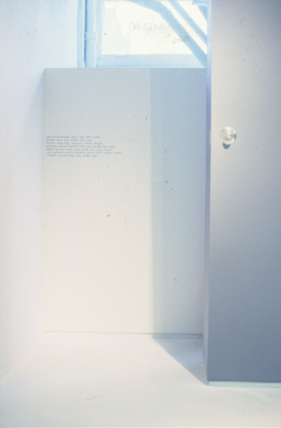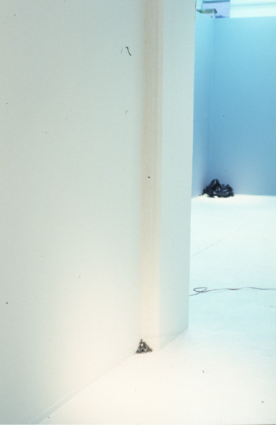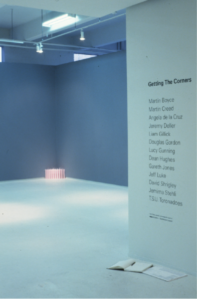 In Getting the Corners our traditional orientation of the gallery space is inverted, In moving away from the centre to the periphery the works inevitably adopt a less determined role for themselves, regecting the ‘spectacular’ nature of a traditional presentation, preferring instead to operate as if by ‘stealth’. The works in Getting the Corners – for the most part discrete, unassuming and sleight – consciously accept their diminished status. Getting the Corners makes no claims on history, rather it operates as a partial survey of the varying responses by a group of young British artists (all of whom are working within the twin legacies of minimal and conceptual practice) to this problematic scenario.