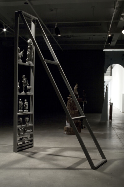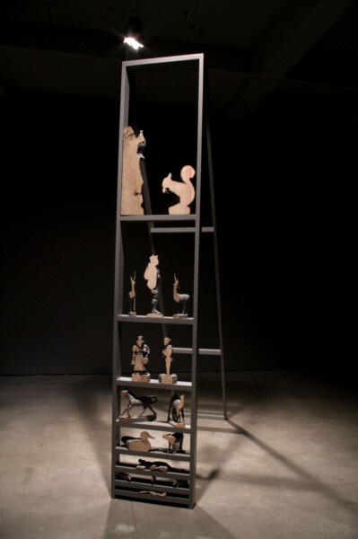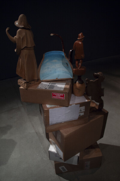 Who That Happens is part of an ongoing investigation of the theme Improperties, a term the artists have coined to describe a desired shift in material sensibilities, both in the act of artistic making and its reception. The cut, from the Latin root of the word decision, is used as a formal device to bring together a series of works that focus on the undecidable status of the human: a being that defines itself as both not-animal and not-divine. In these works, the figure of the cut is presented as a literal manifestation of the decision. However, the cut, or separation, is also the means by which metaphysical ideas such as spatiality, contingency, mortality, and otherness can be figured as interior boundaries within a sense of being-together in the world. In this exhibition the emphasis is on the wandering nature of human subjectivity, expressed not only in the arbitrary nature of the placement of the cuts, the multiplication of surfaces, but also the mobile character of the materials used (for instance, objects found in flea-markets or purchased on e-bay). Ultimately, this structure allows for a wandering interest, historically and intuitively, in the making and presenting of this growing body of work.