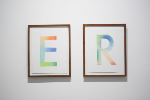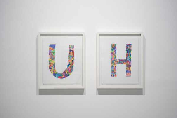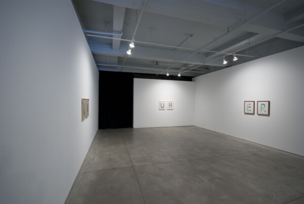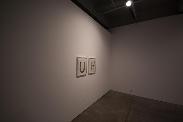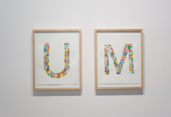 UM, ER, and UH (2008) are a series of drawings that continue Carpenter’s interest in language. The words are classic examples of speech disfluency, parts of speech generally thought to be without purpose, though occasionally used for dramatic tension or effect. Some linguistic experiments, however, have suggested that these utterances may facilitate language, as their removal from speech led to significant decreases in listener comprehension. Carpenter exalts these under-privileged words, rendering them in coloured pencil-crayon as a further means democratisation and as a general reaction to the authoritarianism of much text-based art.