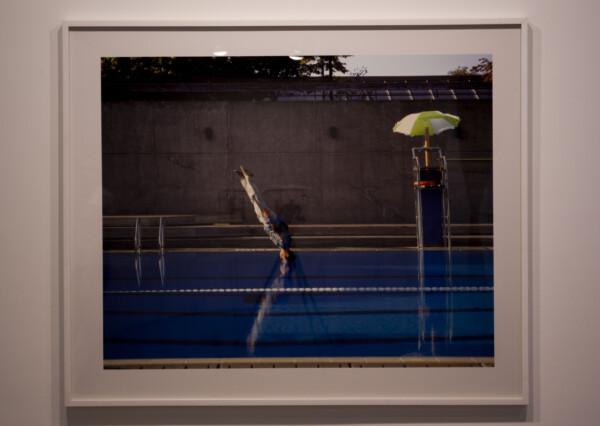 Reminicent of David Hockney’s 1967 painting A Bigger Splash, Steven Hubert’s photograph The Dive (2006) features the artist diving headfirst into a large swimming pool. Contrary to Hockney’s image, however, Hubert’s photograph depicts the moment just as his head touches the pool, with no evident disruption to the water’s surface. Rigid as a board and fully clothed, the artist’s body seems stuck there, propped at an uncomfortable angle. The unnatural circumstances of Hubert’s dive challenges an otherwise simple and anticipatory reading of the image, suggesting that time itself may be in question.