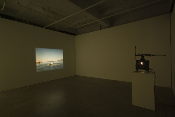 Kathy Slade’s film Tugboat (2007) pictures a tugboat “wrapping doughnuts” in Vancouver’s industrial harbour. The 16mm film loop is both playful and melancholic, as it is unclear whether this workhorse of BC’s resource and shipping economies is caught in playful abandon or if the boat is revolving in a momentary lapse of agency.