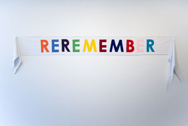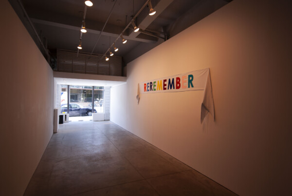 Aaron Carpenter presents Rerememberer (2008), a large fabric banner with REREMEMBER written in large coloured letters. Reminiscent of home-made banners used in public demonstrations, Carpenter’s work plays on the formal construction and etymological roots of the word remember, suggesting that ‘re’ as a prefix in the contemporary sense might be repeatable ad infinitum, that one might rereremember, and so on. As a banner, the word takes on a political importance, making imperative not only the remembrance of history, but also its continual re-examination.