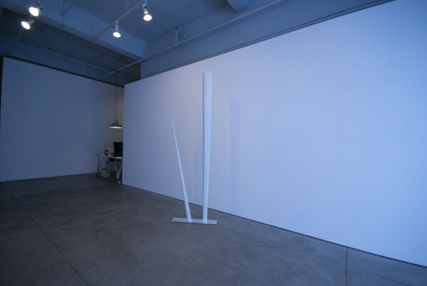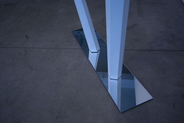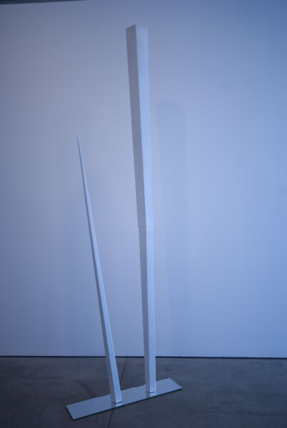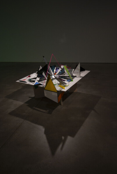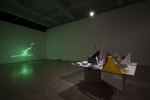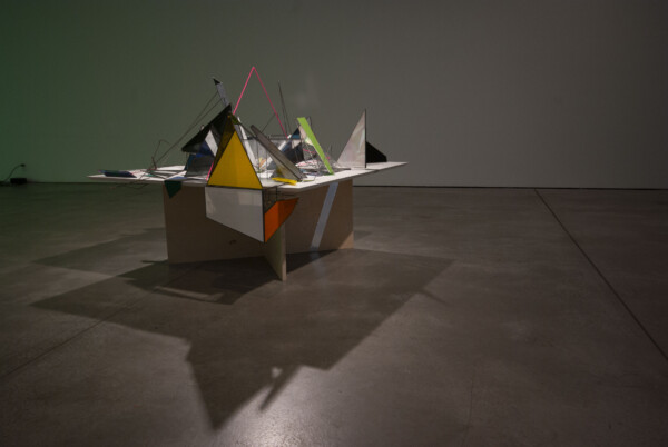Vancouver-based Devon Knowles’ works – Invertible Leaner #4 (2007) and Rock the Stone (2008) are sculptures that explore light, optical perception, and architectural space. Rising from the ground at acute angles, the tall and narrow hexagonal beams in Invertible Leaner resemble both monochromatic skyscrapers and light beams, creating an unusual overturned skyline. Using mirrors, Knowles plays with the viewer’s sense of depth perception while simultaneously challenging the relationship between the space of the viewer and the space of the artwork. Rock the Stone is a three-dimensional extrapolation of earlier (two-dimensional) drawings of gemstones conducted by the artist. This twice-translated work, fabricated primarily from a series of triangular stained glass panels, gives particular emphasis to the chromatic effect of refracted light, while encouraging new permutations as the panels reflect one another and cast light on the sculpture’s white base.