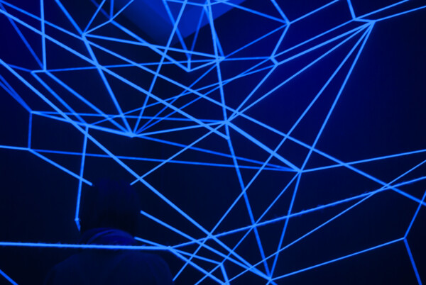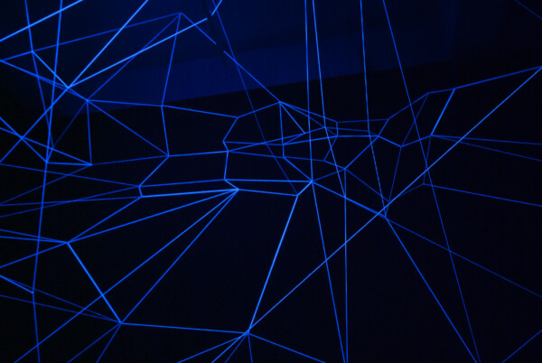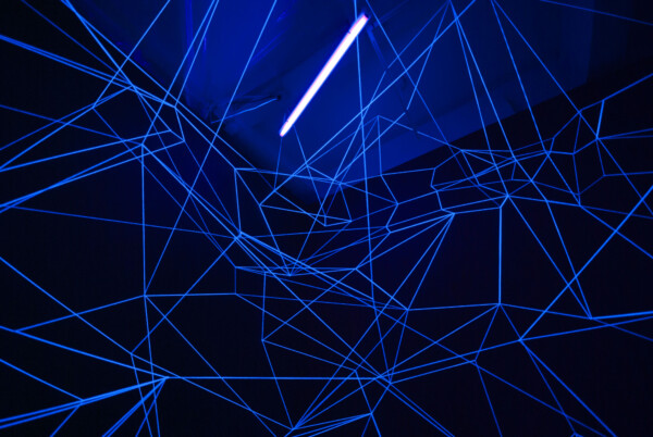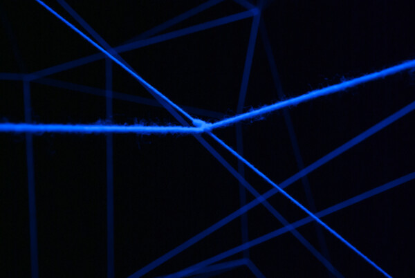 The installation String Cave (2008), by Vancouver artist Miguel da Conceicao, takes its influences from the writings of Canadian architect Daniel Libeskind, a found photograph of a black-light string art ‘pavilion’ circa the 1960s or 1970s, and Marcel Duchamp’s installation, Mile of String, produced for the 1942 First Papers New York retrospective of Surrealist art curated by Andre Breton. Illuminated by a black light, String Cave is a geometric drawing made of white yarn that protrudes from the walls to encompass a darkened gallery space. The installation resembles a computer wire-frame model of a cave interior, employing Op Art techniques to give the illusion of depth beyond the gallery walls.