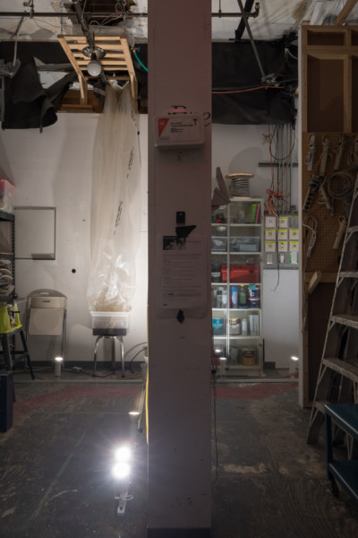 Keeping within the exhibition’s theme of self-reflexivity, Or Gallery’s location as a frequent site of shooting for film and television is referenced throughout Solvent. The title of the exhibition itself plays on associations of insolvent entities and dissolving structures inherent to many non-profit art centres.