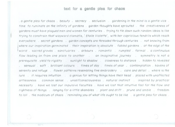 Like scientists, collagists also remove objects from their contexts. But unlike the data collector, the artist’s interest is not in the object as a singular entity but in the changes in meaning which occur when an element is recontextualized. Sebelius has extracted the text used in A Gentle Plea for Chaos from a book on gardens of the same title. But her extraction is much less severe or radical (of the root) than the surgical act of the botanist. It is an appropriation which seems wholly sympathetic to the artifact she has dismantled.