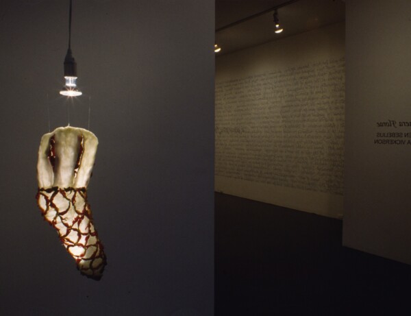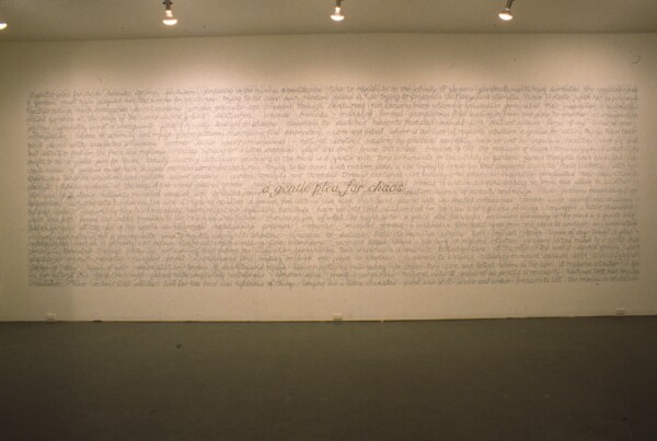 Camera Florae is collaborative installation by Calgary artists Helen Sebilius and Laura Vickerson. Sebelius’ contribution involves the creation of ‘non-objects’ by making images, which are ethereal and transitory, directly on the gallery walls. The artist has written: “the work, comprised of plant and garden images and related text, is made in a way that speaks about the passage of time. Ironically, while the process utilized is labour intensive, the traces left only suggest that a ‘making’ has occurred. The traces are like memories – the work comes near to not existing. The process is a analogy for the nurturing and eventual demise of something of nature.