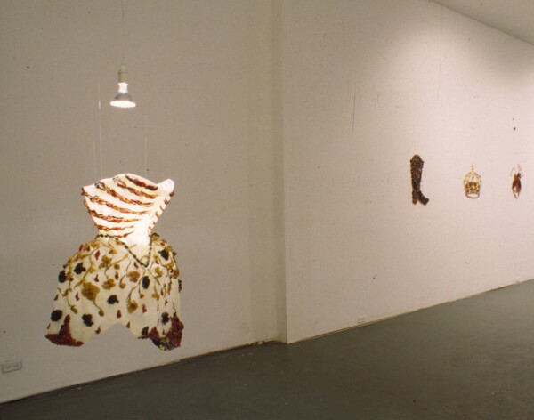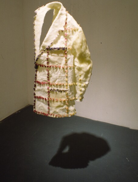 Clothing performs cultural functions, both decorating and hiding the body which, unclothed, is supposed to be, like flowers, natural. Vickerson’s work challenges that duality and allows neither cultural artifice nor biological organism to maintain a sense of complacent integrity. Clothing, rather than being a “second skin” here melds with skin and flesh. The costume/body is pierced, slit, and variously opened as if to uncover a hidden interior truth. However each opening up, reveals only an ambivalence between clothing/body, skin/muscle, appearance /reality, artifice/nature.