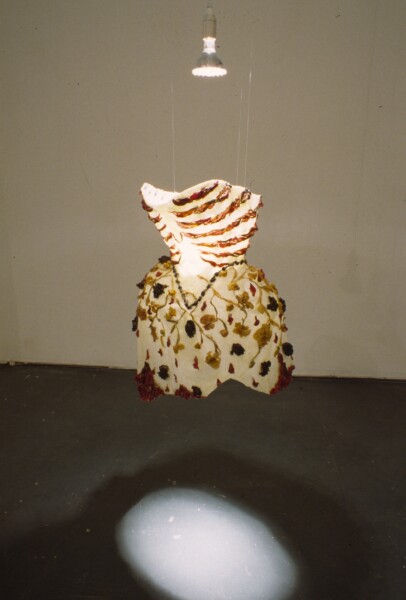 Laura Vickerson is also interested in the transitory quality of the natural world and has created garment like objects using wax forms and plant and flower fragments that elude to the inner workings of the body. The skin-like quality of the wax and red flower petals; like fatty tissue, create a layer of trasnparency acknowledging that these garments neither conceal nor protect. The artist has stated: “The work deals with contradictory qualities of strength and fragility, physical confinement as well as confinement within stereotypes (as in the references to recognizable ‘fashion styles’) and, perhaps most importantly, it speaks about vulnerability.”
