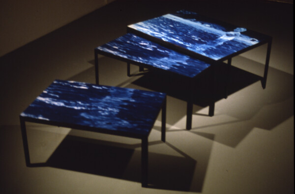 The artist has written: ‘As an installation bleuira points away from that will to chart and name an unknown territory, to reduce meaning to points of exclusion. A direct translation of ‘bleuira’from the French would be; to become blue. The title is derived from a compilation of letters exchanged between Violet Trefusis and Vita Sackville-West. “Quand bleuira sur l’horizon la Desirade.” Here, when translated, bleuira describes that moment when the coastline disappears from the horizon. The exhibition consists of ten, circular steel light boxes illuminating photographic transparencies of the ocean. A compass, embedded in a binnacle stands on the gallery floor. An electronic magnet eases the compass. It slowly moves in a half circle away from north and back again. Sliding the balance again and again from “a truth”, from a specific location to one imagined. Fragmenting the universal and oceanic. Navigating in the peripheries.’ “And what is that terror awaiting them in the shadow? That featureless memory of the terrible fight between slashing breakers and the streaming sails? That peril of water coming from sky and land? And that horror they feel for the might of the sea when she sheds all masks and refuses to be calm, polite, and submississive to the sailors’ direction?”