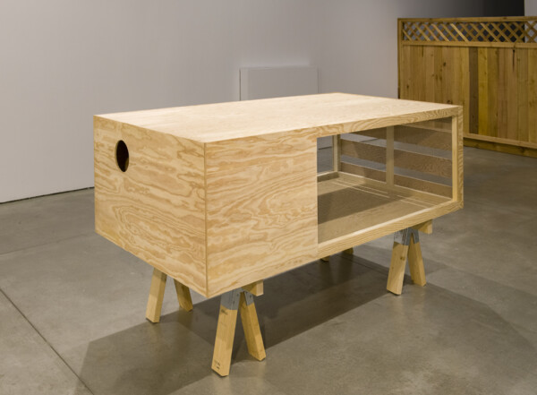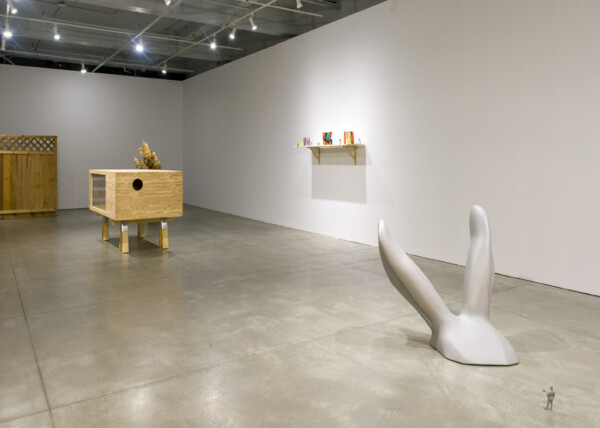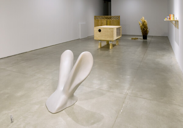 For her exhibition, MacLeod builds from these sources, incorporating an over-sized pair of rabbit ears (initially proposed as a public artwork), along with a rabbit hutch recreated from photographs of the plywood hutch her father built for her family’s pet rabbits in London, Ontario.