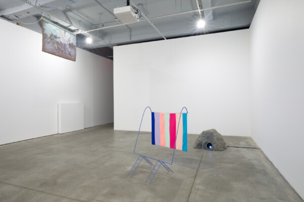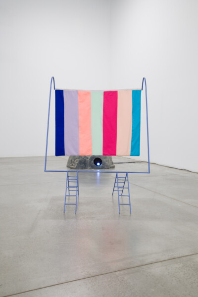A 16mm film installation illustrates fragments of the protagonist’s journey, oscillating between her gaze and the surveillance cameras that track her movements through her concrete jail and the rugged island terrain. Projected from an artificial rock emitting a single beam of light, the film installation moves across different perspectives and reinforces the multiple subject positions that constitute and produce knowledge. A new 16mm film further details the protagonist’s novel research methodologies and elaborates the speculative future she inhabits.