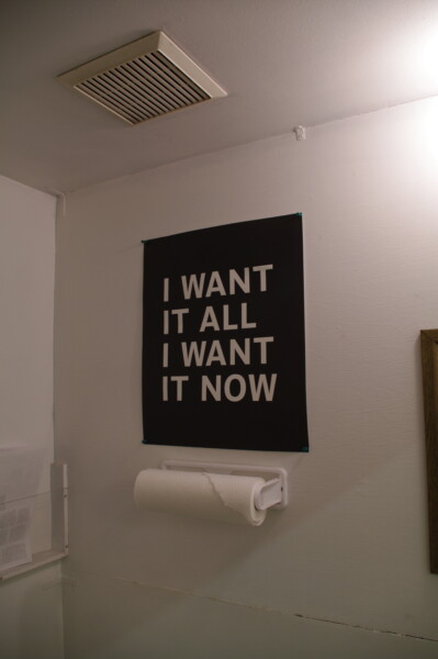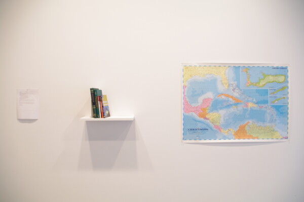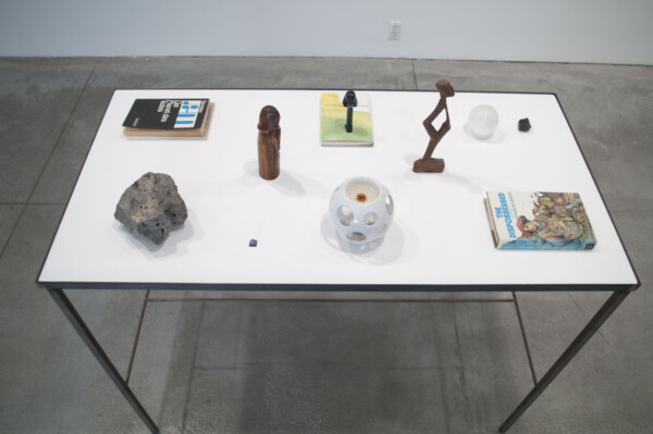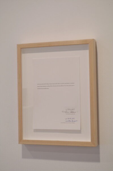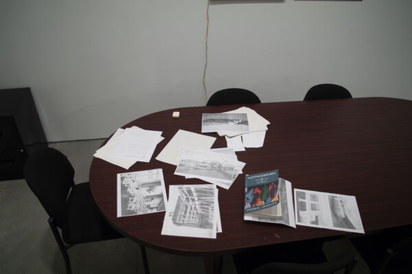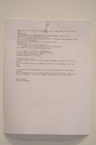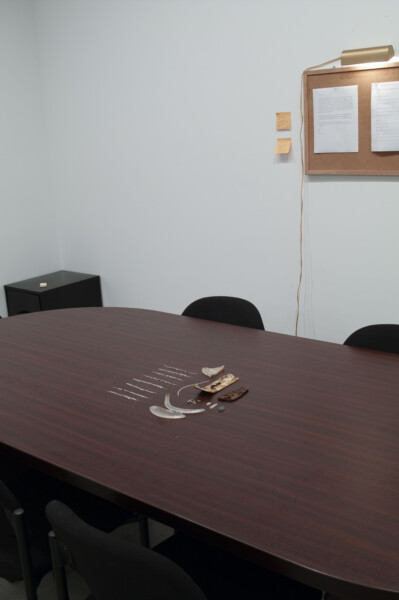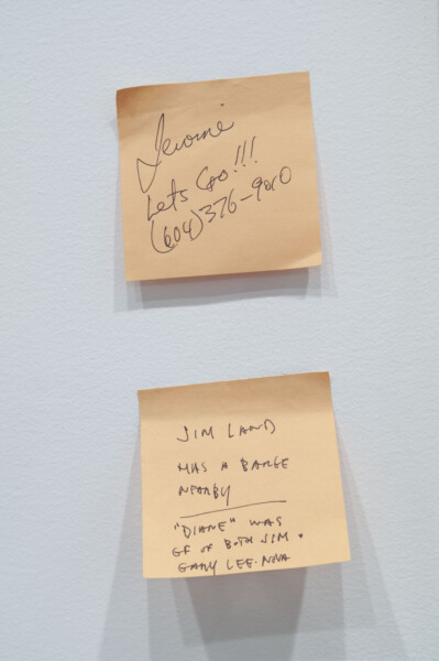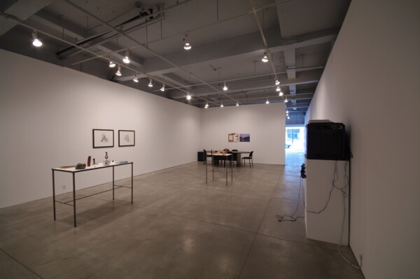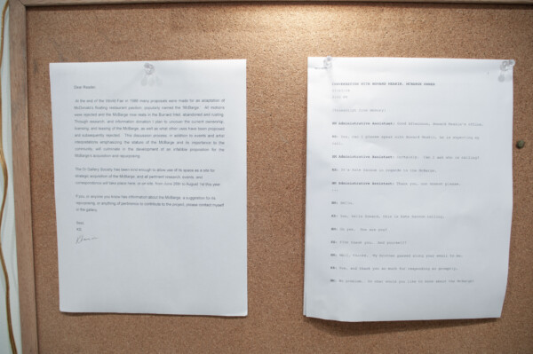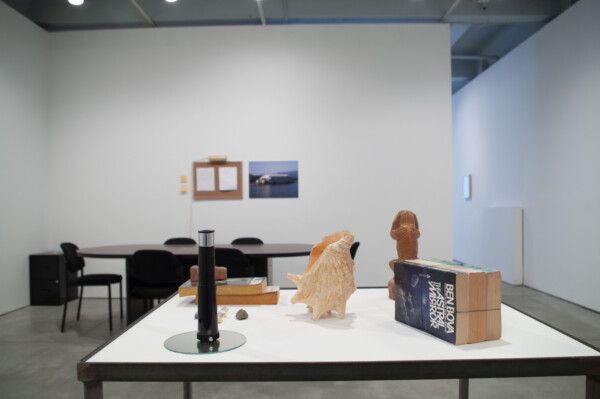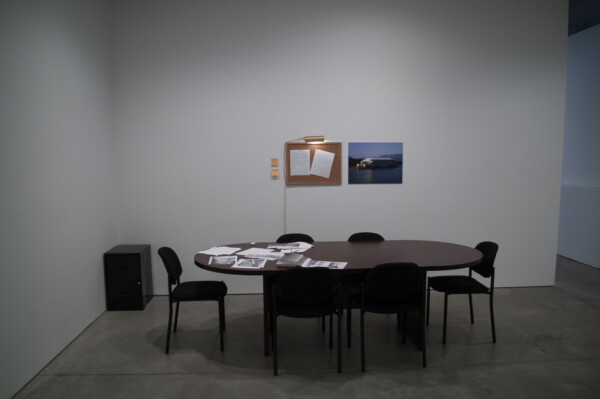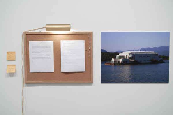 In keeping with the theme of speculation, a number of the works in the exhibition exist in their proposal stage or as works in progress, not to take their final form until some possible later date. For Kate Sansom’s Nothing Is Free In Waterworld, the artist transforms part of the gallery into a working office space with the aim of acquiring the now-derelict floating McDonald’s restaurant from Vancouver’s Expo 86 world fair, intending to put the structure to some productive use. Artists Nicole+Ryan, Håvard Pedersen, and Mark Nakamura similarly make proposals that to varying degrees implicate the gallery in the process. Nakamura’s Back In Five promises the return of someone, likely a gallery staff member, perpetually five minutes in the future.