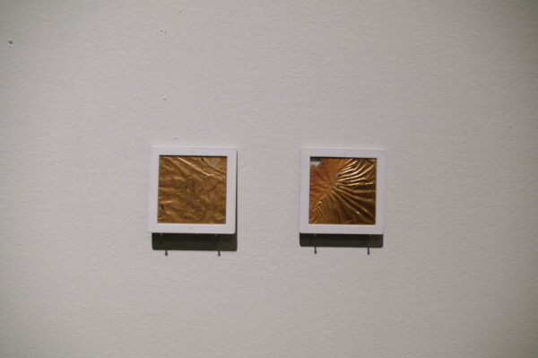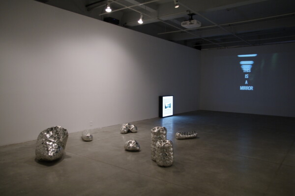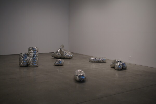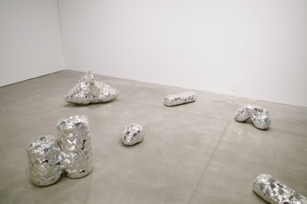 Brian Jungen’s Modern Sculpture (After Iceland) (2005), is a set of amorphous forms—igneous lava rock from Iceland that the artist has covered in the outer skins of Nike soccer balls. The chrome-coloured leather obscures the inner forms, emphasizing the liquid nature of the molten lava. The sculptures appear as though they are suspended in motion, almost like drops of the element mercury, and like mercury they seem to exhibit the same uncanny pull towards the whole. One of the characteristics of the element is its strong attraction to other metals, including gold and silver; it will amalgamate them and create new hybrids, dissolving the other material the process.