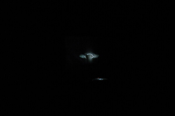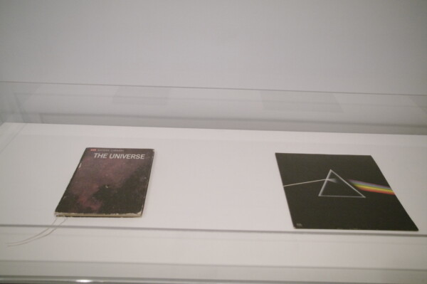 Science fiction is rife with narratives of the extraordinary and the unexplained. Charles Stankievech’s Gravity’s Rainbow (2009) had its origins in a similar moment, when he noticed a chance apparition on the wall of his studio—a sliver of prismatic light that had refracted off of the surface of a vinyl record lying on his desk. Gravity’s Rainbow replicates something of the black magic of this initial inspiration: the work makes use of the vinyl grooves of Pink Floyd’s 12” record “Dark Side of the Moon” to produce a thin sliver of light that hovers on the wall, reminiscent of the rings of Saturn. “The installation’s soundtrack”, Stankievech explains, “is created by placing the needle of the turntable in the last groove of the record, which in turn produces a wash of white noise similar to the sound of background radiation of the cosmos as picked up from deep space radio telescopes”. Gravity’s Rainbow is accompanied by a few select objects: the album cover from the “Dark Side of the Moon”, a book entitled “THE UNIVERSE” from the Time LIFE series, and a photographic document of the orbiting light rings. The installation’s title is a nod to the serendipitous release of Pink Floyd’s generation-defining album in 1973, the same year that Thomas Pynchon’s equally influential book, “Gravity’s Rainbow”, was first published.