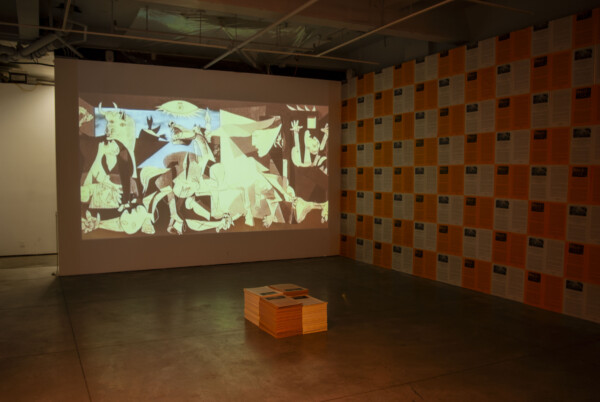 In the works in the exhibition, representations of the occupation and previous wars are conflated in varying ways with those of archival and current protest footage as well as those from the commodity and luxury culture industry. Through the surfaces of travel brochures, montages, photomontages, and broadsides, the works communicate boldly and graphically, like those of agitprop. Functioning also as objects in circulation, each work actively engages with issues of dissemination, distribution, and display.