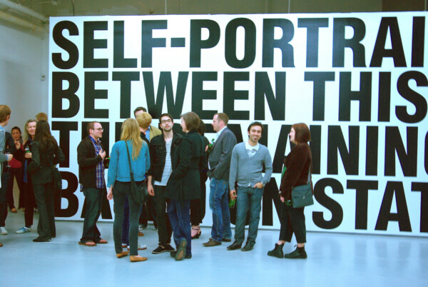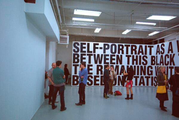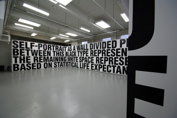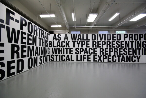 Micah Lexier’s Self Portrait as a wall divided proportionally between this black type representing life lived and the remaining white space representing life to come, based on statistical life expectancy is likewise ongoing, first exhibited in 1998. The text that comprises work itself is sized differently each time it is installed, as determined by the physical dimensions of the gallery space. Contrary to expectation, the ratio between the black text and the white wall do not change but rather continue to reflect the age of the artist at the time the work was first conceived.