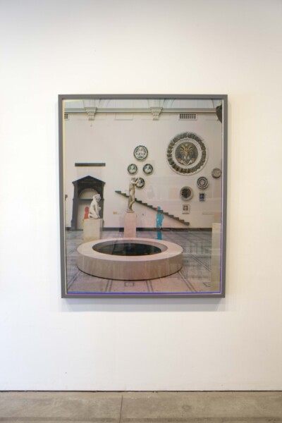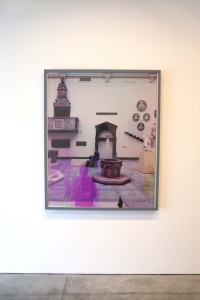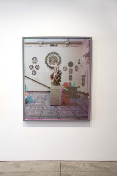 Other works in the exhibition carry a similar layering or doubling. A series of prints of a museum interior produced using the trichrome photographic process, in which each colour of light is captured on a separate black and white negative and then combined to produce a single chromatic print, renders visitors to the gallery as brightly coloured shadows. As each visitor remained stationary for only one of the three photographs required to produce the colour image, their presence is rendered as a passing glitch in the picture.