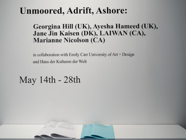 This exhibition is supplementary to the symposium, “Unmoored, Adrift, Ashore,” organized with Emily Carr University of Art + Design and Haus der Kulturen der Welt, supported by a SSHRC (Social Sciences and Humanities Research Council) Connect Grant.